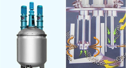 該類釜與不同的反應釜相比,具有多個驅動的優點,各個驅動互不干涉及影響,按工藝需要完成攪拌、分散、乳化等功能,可單獨完成也可搭配使用,實現了一機多用。